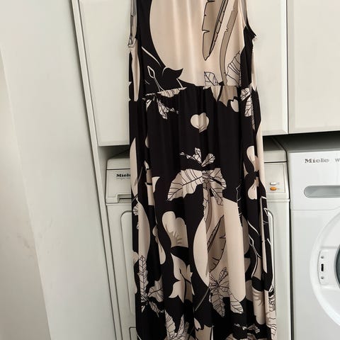 Flot lang kjole i flotte farver. Kjolen er i to lag og er brugt 2-3 gange. Jeg er ikke sikker på, at den er blevet vasket. Der er en lille prik på indersiden på ryggen. 100% bomuld. Måler ca 78 cm under brystet og hele længden er ca 150 cm. Sender gerne.