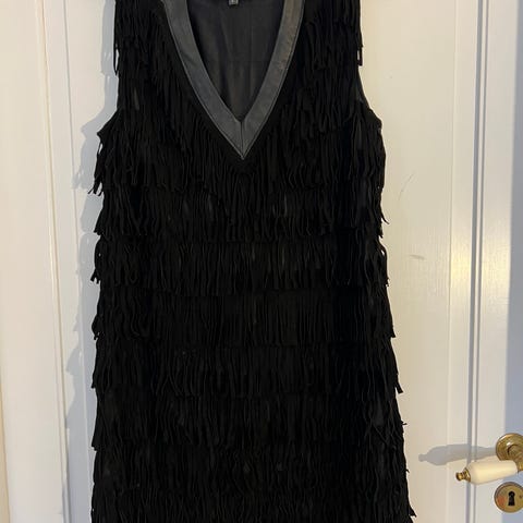 Meget flot designerkjole fra Dalsgaard i sort kalveskind. Har lommer og elastik i bærestykket. Perfekt til fester og nytår.