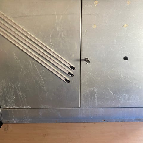 Stålskab, Rustfri stål. Ca. mål H: 120 B: 80 L: 50. Lågen har fået nogle knubs men lukker ok.