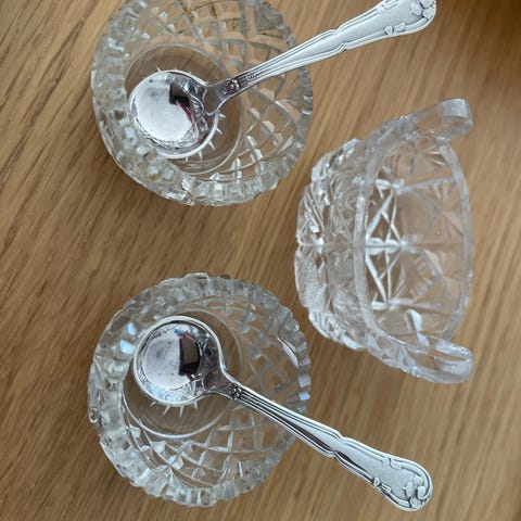 Små charmerende saltskeer i gyldent metal ca 7 cm
