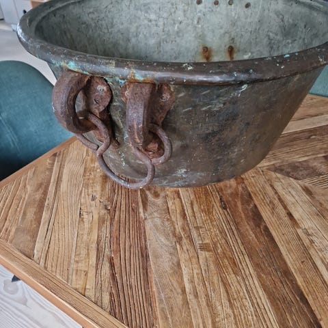 En stor antik bronzegryde, antagelig fra Tyskland, ca. år 1800. Stående på tre ben, med svinghåndtag af jern. Flot stand. Højde 24 cm. Diameter top 24 cm.