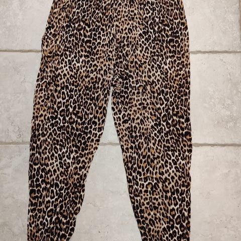 Bukser i leopard mønster fra H&M med lynlåse ved nederste buksekant. 98% bomuld, 2% elastan, så lidt stræk i stof. Måler 69 cm fra skridt og ned, 92 cm i fuld længde og 2x43 cm i livet. Fremstår som nye.