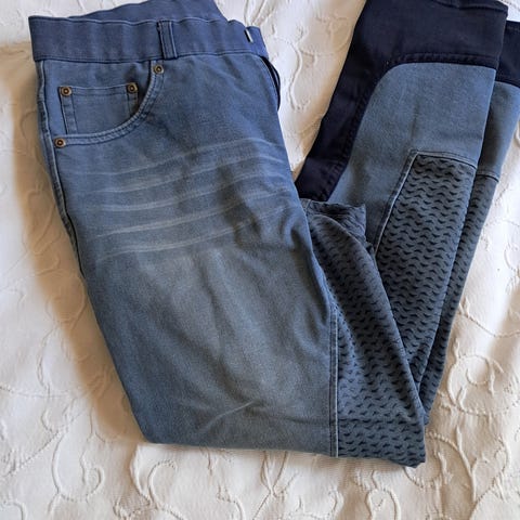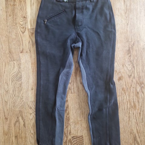 Ridebukser, str. 26, (det er en engelsk str. 26"). Mærket er Mountain Horse. Superflot lavendelfarvet med fuldskind i mørkblå. Lukkes med velcro ved anklerne. Kun brugt ganske lidt.