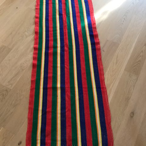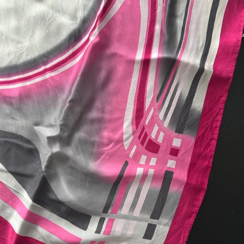 Tørklæde fra Spanien. Rød bund med grønt og mint mønster. Føles som silke med materiale er uvist. Håndstukket kant.