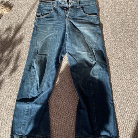 Jeans, Levis Engineered, str. 34, lyseblå, Denim, God men brugt, Et par "kunstlevis" hippie happy pants, Levis engineered str 34. m. Gamle tyske sweitziske broderede, filt souvenir pads, fra 40-50 erne og kunstnerisk tryk m.m.