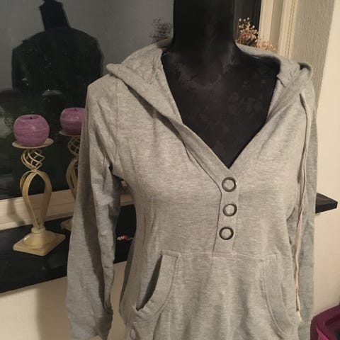 Gråstribet trøje med hætte og bindebånd, Milla, str. S, men passer også str. M. 60% akryl, 40% bomuld