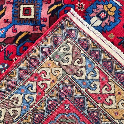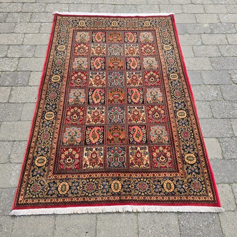 Ægte Persisk håndknyttet tæppe, 113 × 158, uld på bomuld, rent og aldrig brugt. Stærke rød, blå, guld, grønog lyserød farver