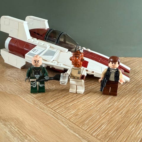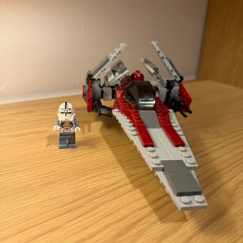 Lego 6207. A-Wing fighter. Fra 2006. Fremstår / der medfølger det som ses på billederne. Samlevejledning er kopi fra nettet. Ved der er følgende mangler ( 30374-1 stk mangler. 43719 - erstattet af hvid. 2446pb02b mangler. Samt sw0082. ). Men se billederne