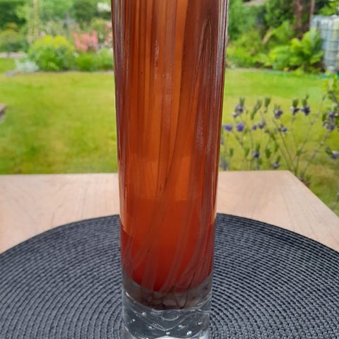 Flot turkis farvet glas vase med mønster, den er 18,5 cm høj og 11 cm bred, den er i fin stand.