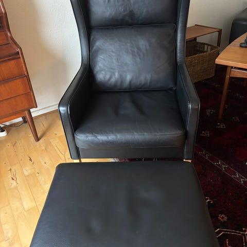 Lænestolen er af sort okselæder. Den er brugt, hvilket man kan se på læderet, men uden større slidtage og ingen umiddelbare revner.