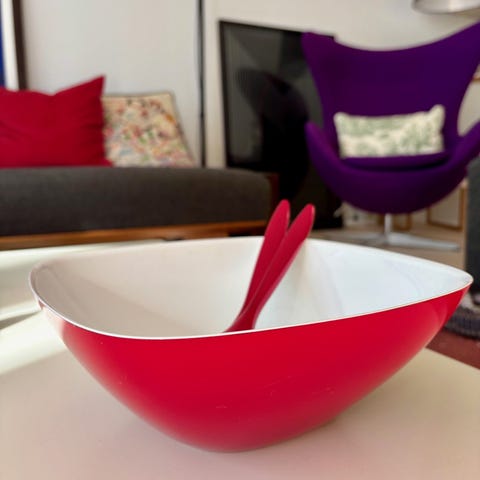 “Guzzinis Vintage-kollektion er kendetegnet ved to toner: en solid hvid inderside og en farverig, klar yderside. Dette par salatbestik har et vintage-look, der er både smukt og funktionelt”