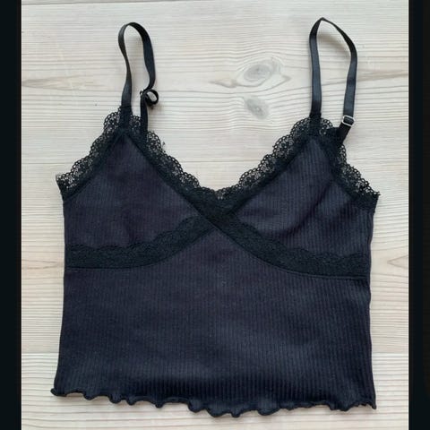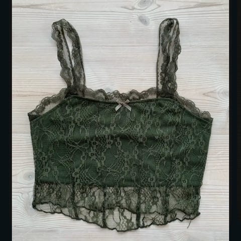 Chokoladebrun top med blondekanter i str. XS fra Shein. Pige 12-13 år / 158 cm. Lavet i polyester.