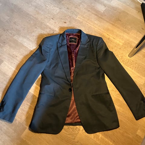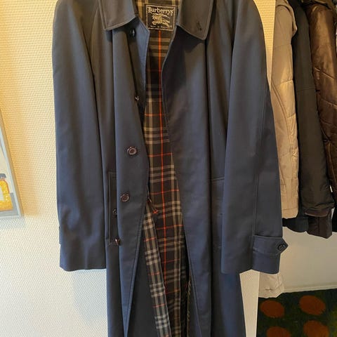 Flot klassisk BURBERRY uld blazer str. 56 (uden bukser) med blå sarte striber i det grå mønster. 2 forlommer med klap og en brystlomme. Indvendigt er der 3 lommer. Fuldforet med flot stribet 50/50 viscose/cupro for.