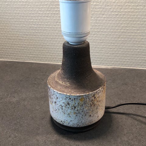 Klassisk bordlampe fra #belkakeramik i rå chamotteler og lys hvid glasur med gule udkrystalliseringer.