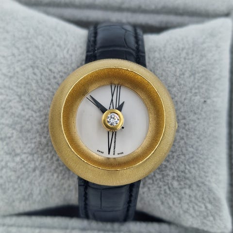 Andet smykke, guld, Ole Lynggaard, Smukt Ole Lynggaard ur i satineret 18 kt. guld, hvid skive med logo, lynette prydet med en facetteret diamant på 0.41 ct. Farve: Wesselton (H), Klarhed: VS1, safirglas, 'skjult' optrækskrone, monteret med ny krokodillerem med originalt foldespænde af 18 kt. satineret guld og stål, quartz urværk. Ø. 33,5 mm. Uret er velholdt og løbende serviceret ved Ranch Svendsen, Vejle. Uret ligger i boks. Seneste kendte nypris på uret er 95 000 DKK. Prisen er fast.