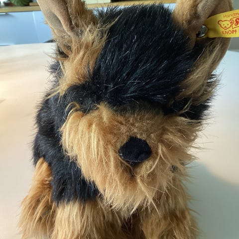1 Steiff Peky, Pekingeser. Lidt solafbleget, men ellers velholdt. Bevægeligt hoved, har stadig det originale mærke og knap. Kr 250