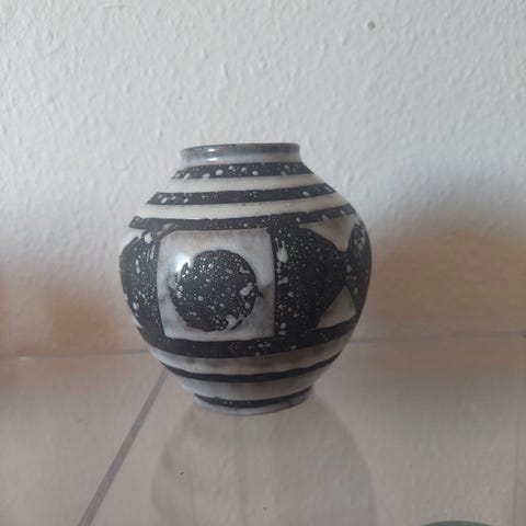 Sort vase med blågrønlig dekoration