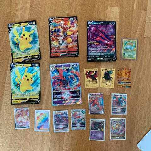 Pokemonkort fra da jeg var yngre. Jeg sælger dem da jeg ikke har interesse for emnet længere. Jeg ved nogle kort kan være meget værd, så jeg har indtastet alle kort på en app, som sagde de islt var værd 5761 kroner, men da de er i brugt stand sælger jeg dem billigere. Købet indeholder, en samlebog med ca 180 kort. En mindre bog, som kan bruges til vigtige kort, en madkasse, tegneblok og blyanter.