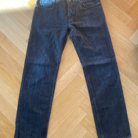 Hugo Boss jeans i blå farve, størrelse W34 L. Lavet af bomuldsmateriale, velegnet til mænd.