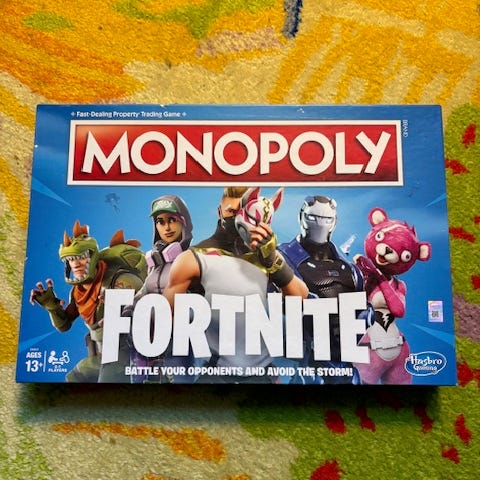 Fortnite udgaven af monopoly / matador. Spillet en gang eller to. Fra 13 år.