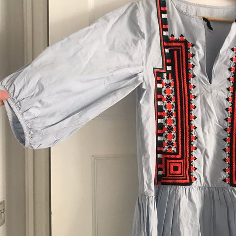 Hvid sommerkjole / konfirmationskjole / pigekjole af broderie anglaise stof. Bådudskæring og skørt med meget vidde. Lynlås i siden. Der er en mindre skade ved den ene skulder / på den ene side af halsudskæringen.