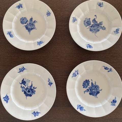 4 stk. blå blomst kantet frokosttallerkener nr. 8550, alle 2. sortering. Sælges samlet for 500,-