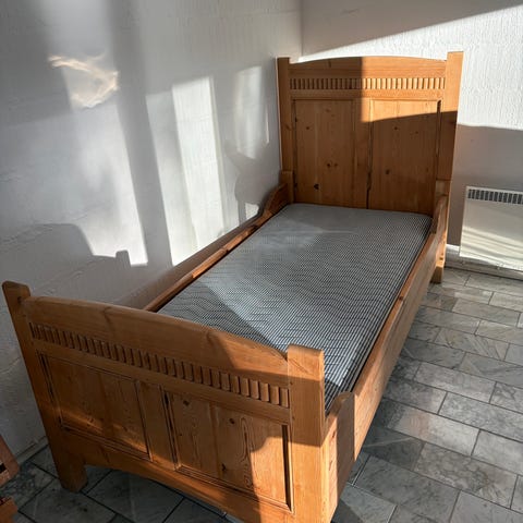 Køb køb!!! Meget fin gammel karlekammerseng, min søn har elskede den og siger at den ligner et slot. Nu er han blevet for stor til den. Fed børneseng har den været hos os, da der jo er højekanter/sengehest på. Den er i god stand og er enormt nem at samle. Blot 4 meget store skruer og så skal lamellerne i bunden. Det tager 10 min. Den er skilt ad. Kan hentes i Stubbekøbing. Kom glad 🤗