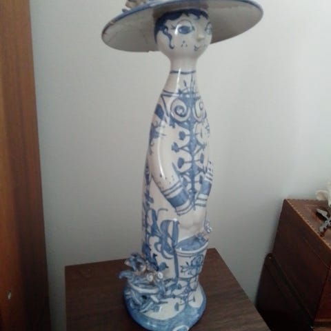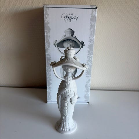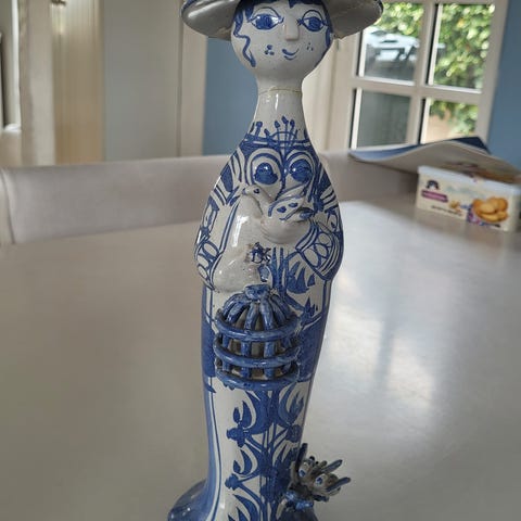 Porcelænsfigur udformet som en stående dame i blå-hvid dekoration. Figuren har bred hat med blomsterdetaljer og mønstret kjole med geometriske og florale motiver. Egnet som dekorativ genstand til reol, hylde eller vitrineskab.