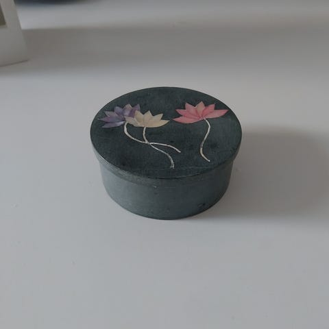 Til opbevaring af smykker, mm. Der er ingen stempel. Mål ca. 10 cm i diameter.