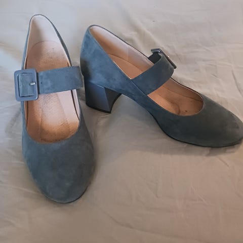 Lækker grå Roccamore sko, ruskind med glimmerhæl; som ny, kun en enkel lille 'streg' på siden af højre sko (se billede 3). Den er desværre købt for lille, derfor kun brugt 2 gange. Original æske og dust-pose medfølger. Nypris kr. 2200,-