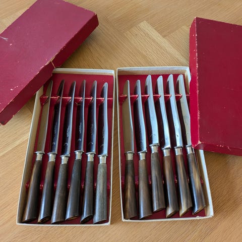 4 stk. knive fra Dansk knivfabrik Tinse Lundtofte Stainless. Den ene kniv har en lille revne på skaftet der ikke har nogen betydning. Kun udsenet. knivene er fra omkring 1965. Velbevaret og brugt lidt.