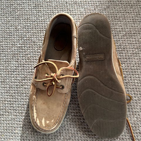Blåt ruskind med brune glatskinds kanter og hæl, m sort skindfoer