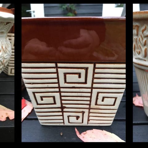 Den aflange, bådformede potte er i plastic, men ligner porcelæn eller keramik. Den er så flot i faconen. Målene er 45 cm lang og 15 cm høj: 40 kr.