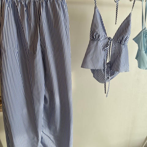 Andet, H&M , str. 36, Blå, Polyester, God men brugt, Smukke blå bukser i meget tyndt og let stof. Der er foer i bukserne for oven, så de kun er let gennemsigtige i selve benene. Der er en lille syning på det ene bukseben derfor lav pris.