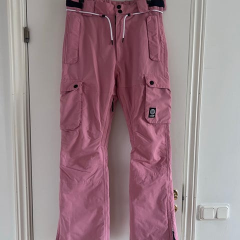 Skibukser fra Henri Duvillard. I sort vind- og vandtæt stof. Foret med et termo stof. Der er to lommer foran, de lukkes med Velcro. Der er to lommer på bagsiden. Forneden er der lynlås på hver side samt et ekstra lag som sættes ind i skistøvler. Der er et aftageligt bælte. Der står str 40, men jeg syntes at de passer bedst til 36-38.