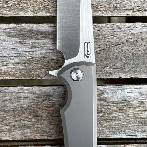 Utrolig stor massiv og smuk imponerende kniv der kan holde til noget med stempel af Gil hibben logo på begge sider af klingen den er virkelig et monster af en kniv og meget gennemført!