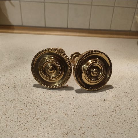Gardinholdere gamle i messing. Bruges til at holde gardiner til side i siderne