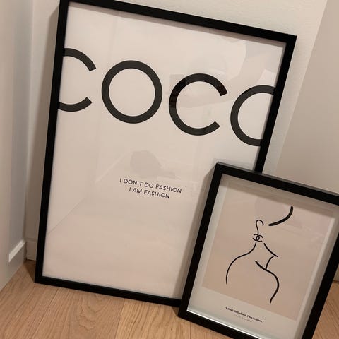 Jeg sælger mine to ikoniske Chanel plakater inkl. rammer. Rammerne er sorte, kommer fra IKEA (Lomviken) og har ingen brugsspor. De måler 50 x 70 cm. Sælges kun samlet.