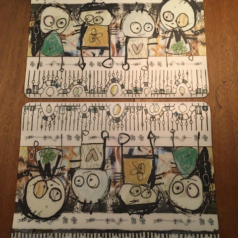 Det drejer sig om en af de gule dækkeservietter, en dækkeserviet med teksten “Be good to other people”, samt en dækkeserviet med teksten “Hele verden mangler blomster”. Sidstnævnte har flere huller i det ene hjørne af korken samt et lappet hul. Se billeder.