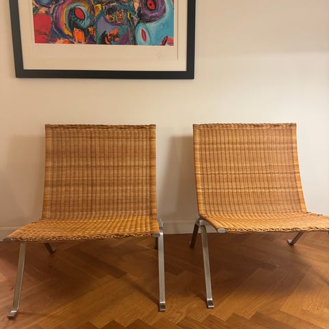 2 stk. PK22™ lænestol i Classic læder og stel i matforkromet fjederstål fra Fritz Hansen. Farve: sort. Design: Poul Kjærholm.