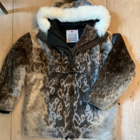 Ringsæl og hætte med ræv. Læder i bunden af anorakken, ærmerne og forstykket. Der er brystlomme med lynlås og gennemgående lomme i bunden.