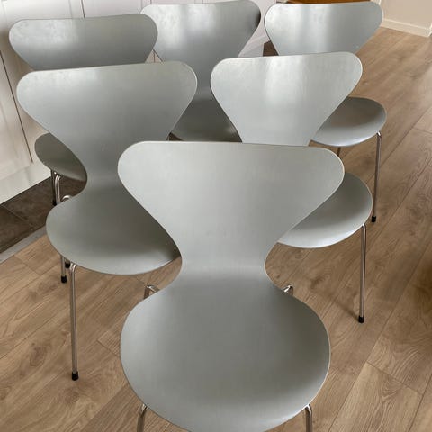 designet af Arne Jacobsen og produceret af Fritz Hansen, sælges samlet. Alle stolene er nyompolstrede i en ocean blue farve af en professionel møbelpolstrer og har ikke været i brug siden, da spisestuen blev lavet om til kontor kort tid efter. De står derfor i fuldstændig ubrugte efter ompolstring samt de har fået nye fødder.
