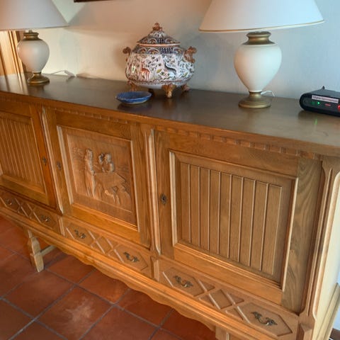 Solid og tung skænk i egetræ. Spejlplade kan tages af, men efterlader huller i topplade, se foto.