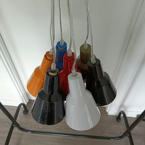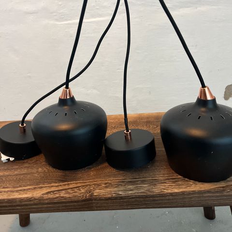 Smart loftslampe fra Frandsen Lightning. Farven er sort crome og der er 5 stk.hængende i en klynge. Længde på ledningerne kan justeres. Diameteren på lamperne er ca. 13 cm på det bredeste og ved åbningen i bunden 9 cm. Kommer fra ikke ryger hjem. Nypris ca. 2.700 kr.