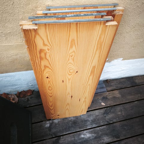 3 FLEXA hylder i fin stand til stigereol. De er i fyrtræ og farven ludbehandlet (original farve)