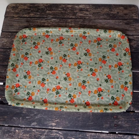 Bakke med træhåndtag og porcelæn dekoreret med blomster 25 x 15,5 c 5,5
