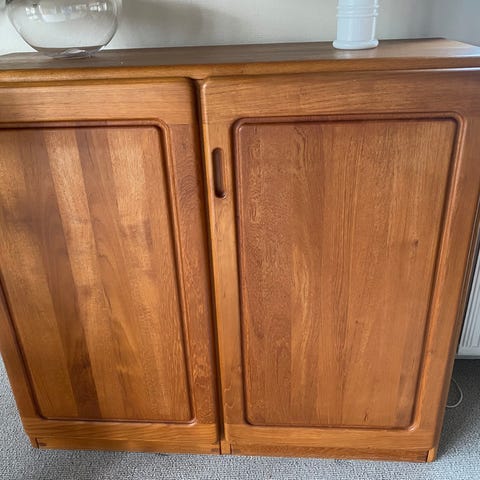 Skab i teaktræ med skydedøre. Skabet har hylder indvendigt og står på ben. Materialet er teaktræ, og designet er enkelt og funktionelt.