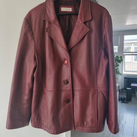 Læderjakke i str. 38 i bordeaux i ægte læder. Den er aldrig brugt, så er som ny.