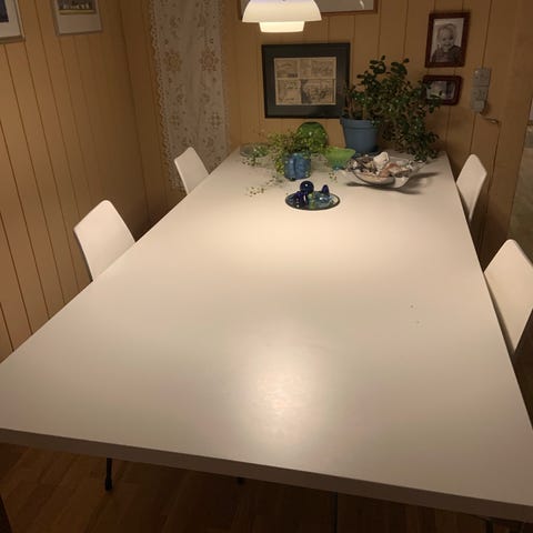 Hvidt spisebord på 200cm med mulighed for tillæg af 50cm og 2x50cm til i alt 300cm. Brugsspor som på billede. Kan slibes ned og blive som nyt.