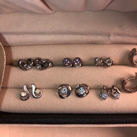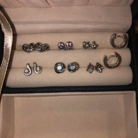 2 sæt øreringe sælges. Det ene par er med grå perler der måler 1 cm i diamter ,det andet er med små sølvkugler og blodsten,de måler 2 cm. i diameter. Fremstår som nye. Pris er for begge